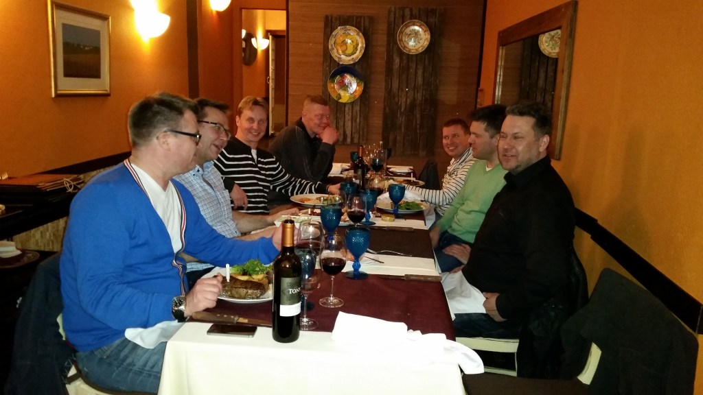 Saavuimme melkein aikataulussa majapaikkaamme hotelli Vila Galeen. Varsin mainio 4 tähden hotelli rannan ja keskustan tuntumassa. Nopea majoittuminen hotelliin ja autokyydillä kylän parhaaseen pihviravintolaan. Pöytä laitettiin tietenkin koreaksi valtavilla pihveillä ja punkulla. Itsellä viikko tolkulla kestänyt flunssa oli sen verran ukkoa syönyt, etten täysin rinnoin pystynyt mainiosta pihvistä nauttimaan. Sen verran kuitenkin, että mestaa pystyy kyllä suosittelemaan paikkakunnalle eksyville. Olo oli tosiaan sellainen, että Ollit päättivät lähteä valmistautumaan vuoden ensimmäiseen golfkierrokseen nukkumalla. Muut lähtivät vielä katsastamaan yökuppilatarjontaa kylille.