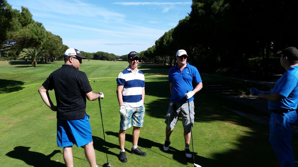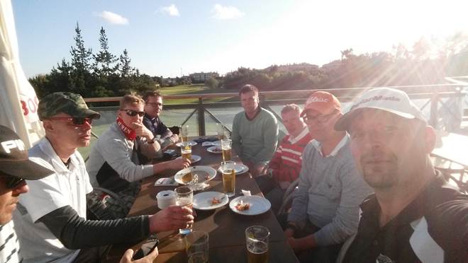 Ensimmäinen aamu valkeni auringon paistaessa. Fiilis oli tosi huipussa. Alas brekkarille, joka oli todella jees. Mielestäni taso oli Thaimaa hotellien luokkaa niin laadultaan kuin monipuolisuudeltaankin. Kruununa skumppaa, jos sitä jonkun sattui tekemään mieli aamutuimaan. Hyvin syödyn aamiaisen ja kamojen vaihdon jälkeen siirryttiin pihalle odottamaan noutoa ensimmäiselle kentälle, joka oli Estoril Golf. Eväskaljastoppi oli tietenkin pakollinen, jota kuskimme Antonio tässä kohden ehkä vähän vielä hämmästeli. Ei kyllä hämmästelisi kauaa. Saavuimme lähes kylän keskustassa olevalle kentälle auringonpaisteessa. Keli oli hyvännäköinen, mutta kuitenkin pikkaisen omaan makuun nähden viileä. Pientä säätöä golfautojen kanssa ennen rundille pääsyä, mutta sitten baana oli vapaa. Edellisenä iltana arvottujen joukkueiden mukaan lähdettiin matkaan. Ensimmäisen ryhmän avaukset menivät enemmän ja vähemmän persiilleen liian innon ja liian pitkän tauon vuoksi. Skele taisi olla ainoa joka ei mulligaania tarvinnut? Matkaan kuitenkin kaikki päästiin vaikeuksista huolimatta. Kenttä oli aivan erinomaisessa kunnossa. Helmiä sioille osa kaksi. Pelin taso, ainakaan ykkösryhmän osalta, ei päätä huimannut. Mutta mahtavaa oli joka tapauksessa. Aurinko paistoi, hienot puitteet ja erinomaista seuraa. Eipä sitä lomaltaan paljon muuta voi toivoa. Pelin edetessä myös lyönnit ja pelin taso paranivat pikkuhiljaa. Mika puhui järkeviä, kun totesi rangella käynnin olevan avuksi näin alkukaudesta. Mitäpä luupää siat sellaisesta vinkistä välittävät, tekevät juttujaan omalla sikamaisella tavallaan vuodesta toiseen, mm. ilman rangea. Kierroksen päätyttyä Mikan tulos oli omaa luokkaansa, mikä ei sinänsä yllättänyt ketään. Kaikki olivat saaneet kuitenkin lyötyä tyhjät pois ja tästä olisi hyvä jatkaa. Päivä oli ollut huikea kokemus, ei niinkään pelillisesti vaan kokemuksellisesti. Clubin terassilla oli muikeaa nauttia bisset ja pientä purtavaa ennen paluuta hotelille. Kelikin oli lämmennyt päivän aikana, ja aurinko helli liian pitkään kylmässä haudottuja Sikoja!
