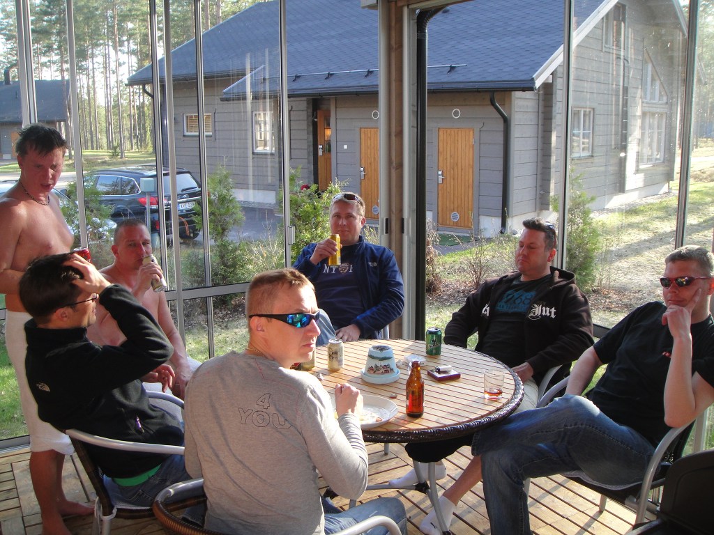 Kokouksen jälkeen illan ohjelmassa oli tuttuun tapaan saunomista ja yleistä hälinää. Jollain tapaa porukka saatiin roudattua vuosi sitten avatun hotelli Scandicin yökerhoon ja sinne on päästy sisäänkin. Napsuja on kannnettu pöytään siinä määrin, että astelu takaisin mökille on saattanut olla horjahtelevaa. Jälkipelit mökillä olivat vauhdikkaat, sillä Jabbarin ja Karrin leikkisän sikapainin myötä sikapokaali tuli muotoiltua uuteen uskoon.