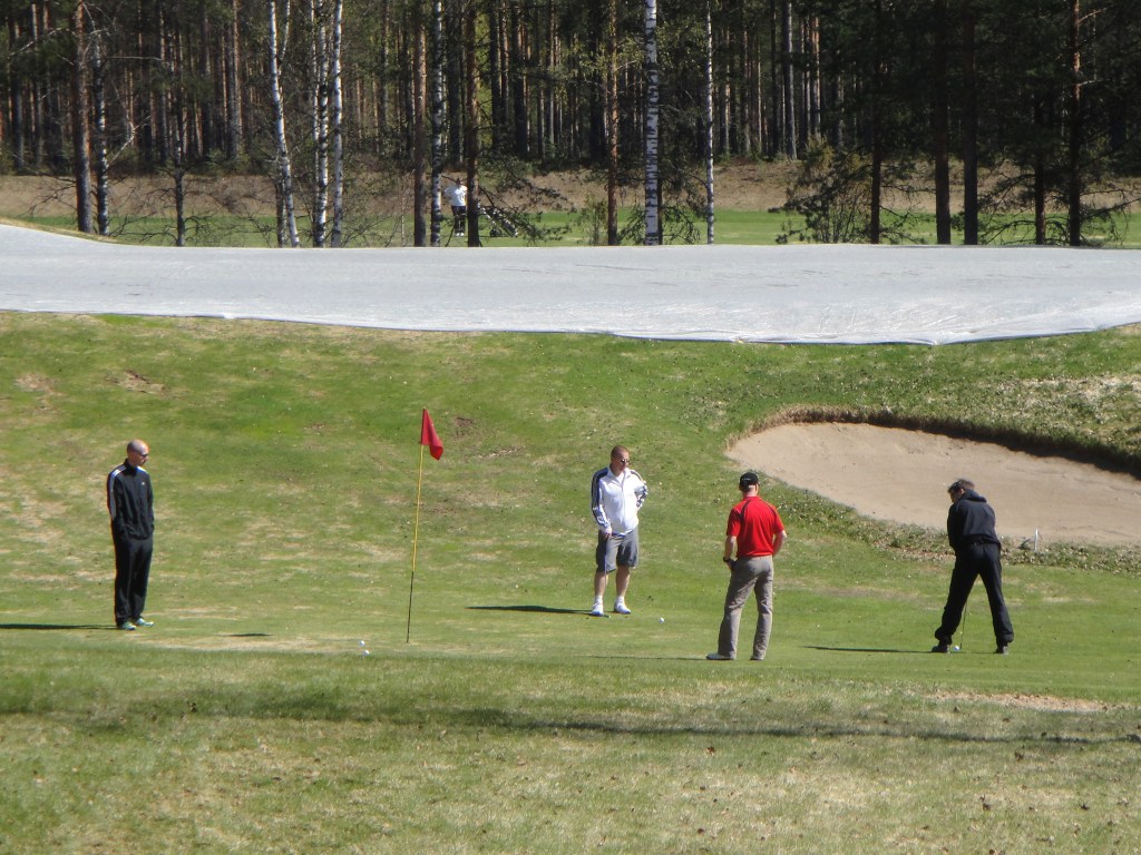 Lauantaiaamu aukesi lämpimänä ja aurinkoisena, vaikka osa nasuista ei siitä juuri nauttinutkaan. Taisi muutamalla raukalla olla vähän kankkusenpoikasta. Kaikki 11 saatiin kuitenkin roudattua puolilta päivin klubirakennukselle ja pelaamaan historian ensimmäinen Röhnösikagolf – yhdistyksen virallinen golfmestaruusturnaus. Pelit pelattiin Vierumäen Coach-kentällä eli par kolmosella. Sinne saatiin koko ryhmä mukaan, sillä kenttä ei edellytä green cardia. Kenttä oli valitettavasti vielä talvikuosissa eli kaikilla väylillä oli käytössä talvigreenit. Pelaajat jaettiin kolmeen lähtöryhmään, joista ensimmäistä klo 12.20 startannutta ryhmää ohjasti Late. Laten johdolla kiersivät todelliset golf-sankarit Veikko, Keiko ja Skele. Alkuviikosta ei olisi vielä uskonut näkevänsä noita vesseleitä golfmailan varressa kiinni – ikinä.