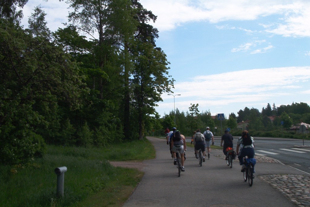 Luistimilla haasteeseen vastasivat Late (vasemmalla perse pystyssä), Veikko, Karri ja Jabbar (viittoilee oikealla). Leppoisammin fillareilla Tikkurilasta matkaan lähtivät Peki, Samu, Härkä, Keiko ja Sami. Kymmentä yli kymmenen pääsimme matkaan ja suuntasimme aluksi Hakunilaa, tuota läntisen Euroopan persläpeä, kohti. Säiden haltijat olivat sioille suosiollisia tällä kertaa ja saimme matkata suht lämpimässä puolipilvisessä kelissä. Pieni tuulenvire takasi, ettei meno ollut liian hiostavaa.
