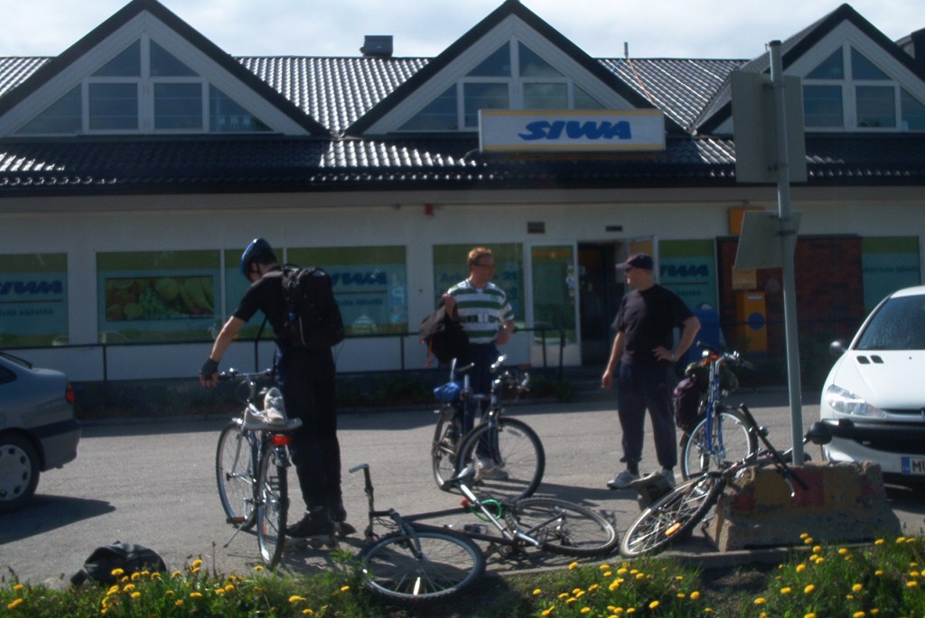 Hakunilan ja Sotungin kautta etenimme Itäsalmeen Sipoon puolelle ja edelleen Vanhaa Porvoontietä itään päin. Veikkoa jouduttiin vähän venailemaan, kun se sai kiven renkaidensa väliin jarruttamaan menoa. Eka varsinainen breikki pidettiin Itäsalmen Siwan pihassa ja fillaripojat kävivät hakemassa vähän bisukkaa ja sidukkaa matkaevääksi.