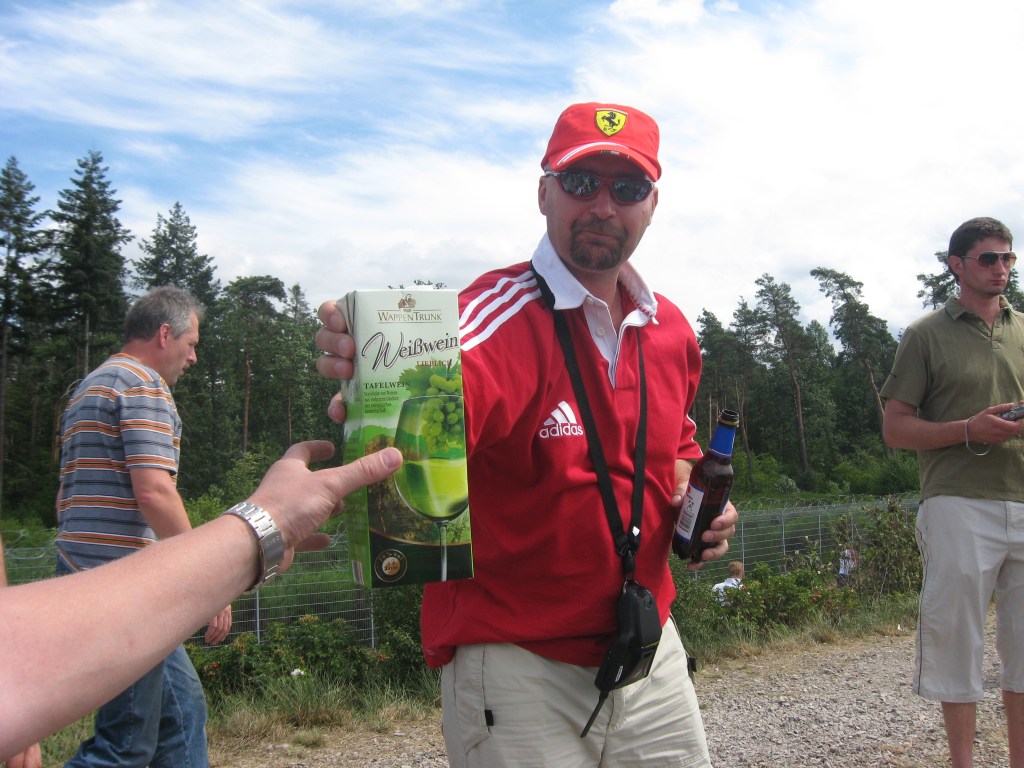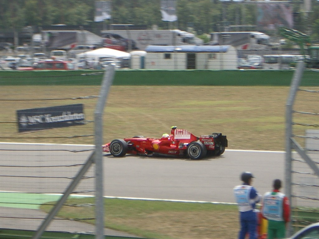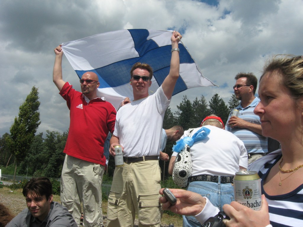 Hockenheimissa päästiin juna-asemalta saman tien parin kilsan matka dösällä radan kupeeseen. Siellä kierreltiin pari tuntia, että saimme liput haettua noutopisteestä ja sitten etsittiin omaa Parabolika Stehtplatzia. Tissuteltiin hissuksiin ja ihmeteltiin kovasti formuloiden hurjaa vauhtia. Meidän suoralla vauhti nousi pitkälti yli kolmensadan. Ilman Kangaroo-vuokralaitetta – kannettavaa online-tulospalvelupäätettä – ei olisi ollut hajuakaan tilanteista, mutta siitä nähtiin Heikin tulevan aika-ajoissa kolmanneksi ja Kimin kutoseksi. Tulos oli pieni pettymys. Meillä oli iso Suomen lippu heilumassa ja sitä kuvattiin kovasti.