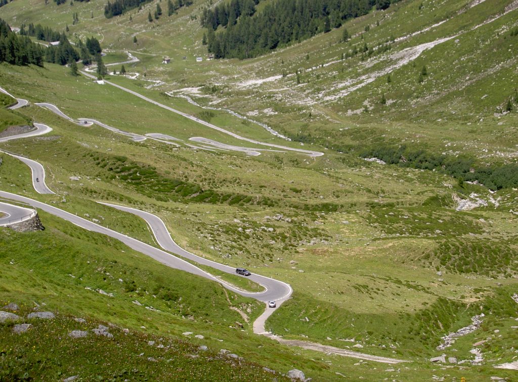 Seuraava taival St. Moritziin oli upeaa mutkapätkää ja hyväkuntoista serpentiiniä. Ilma viileni taas nopeasti noustessa. St. Moritzin jälkeen tuli vettä, mutta baanakin oli tasaisempaa. Suschin kohdalla käännyttiin Davosiin Flüelapassen kautta. Korkeutta oli enimmillään 2383 metriä, vettä ja rakeita satoi, tien varrella oli lunta ja oli todella kylmä. Maisemat olivat aika karuja ja ohuen ilman takia konekin esitti aavistuksen verran hyytymisen merkkejä. Davosiin laskeuduttiin aikalailla ja sinne saavuttaessa pyörittiin tovi huoltsikkaa etsiessä.