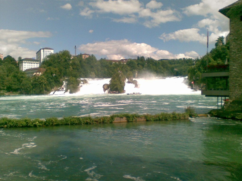 Seuraavaksi ajettiin pienempiä väyliä Villingeniin. Viikonlopun riekkuminen vaati veronsa ja nyt alkoi väsy painaa. Lyhyt stoppi ja jaloittelu Villingenissa piristi ja jatkettiin isompia baanoja kohti Schaffhausenia. Sveitsin rajalla piti ostaa 40 CHF:n (n. 25 euroa) vinjetti eli tietullimaksu koko vuodeksi. Rajalta ajettiin hyvin opastettuja väyliä suoraan Rheinfallille eli Euroopan suurimmille putouksille – vesimäärältään suurimmille. Ilma oli kirkastunut ja upeata putousta ihastellessa tuli haalareissa jopa kuuma. Loppuryhmältä oli tullut viestiä ja olivat aikalailla perässä.