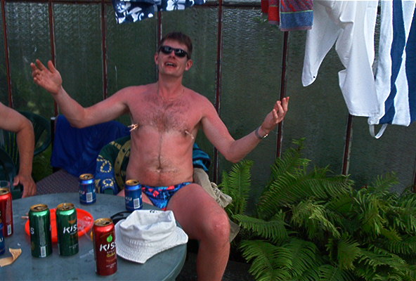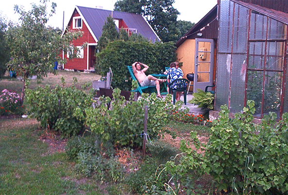 Takaisin kämpille ja eikun sauna kähisemään vaikka ulkona 30 astetta hellettä ja terasille kännäämään. Tommi pääsi hyvään vauhtiin ja bastukin saatiin lämpimäksi ja vesisäiliöt täyteen ja samalla kasteltiin myös pihamaa kun Helge unohti kertoa että säiliöiden varoventtiili oli aika omituisessa paikassa eli katolla, Keiko tarkkana poikana huomasi että katolta suihkuaa vettä ja maa talon vieressä oli jonkin verran märkä.