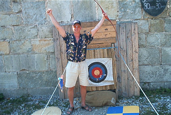 Linnassa käytiin juomassa kahvit vahtitornissa joka tarkoitti Karri ja Veikko parit näkäräiset ja Tommille Bisse, Keikolle vesi ja ite join kahvin ja poltin röökin. Linnassa kun oltiin niin löytyihän sieltä keskiaikaista urheiluakin jota oli pakko kokeilla, jousiammuntaa. Aluksi näytti siltä että minä olisin vahvin tässä lajissa 4 nuolta tauluun 4:stä ja pisteitä 35, Keikon, Veikon ja Härän tulosta ei kehtaa edes mainita mutta Karri yllätti taas ja sai itsensä skarpattua ja ampui 36 pistettä ja ilmaisen Bissen.