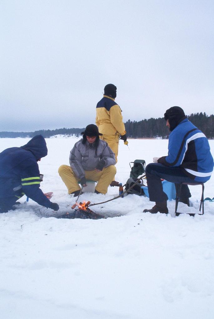 Hannukin poimi yhden pienen ahvenen eikä jäänyt härkämäisen noloon tilanteeseen, ilman fisuja. Keikon kokonaissaaliiksi tuli neljä komeaa ahventa, pari rääpälettä ja läjä kiiskiä. Samille tarttui pari kohtuullisen kokoista ahventa, pari alamittaista ja lauma kiiskiä. Hienosti valitut valmiiksi kairatut avannot; kiitokset paikalliselle vesselille, joka oli reiät tehnyt. Kaveri taisi vaan manailla vieressä, kun humaltumaan tulleet äänekkäät siat poimivat kalat ilmiömäisellä moukan tuurilla. Aikamme pilkittyämme iski nälkä ja duunattiin nuotio makkaranpaistoa varten.