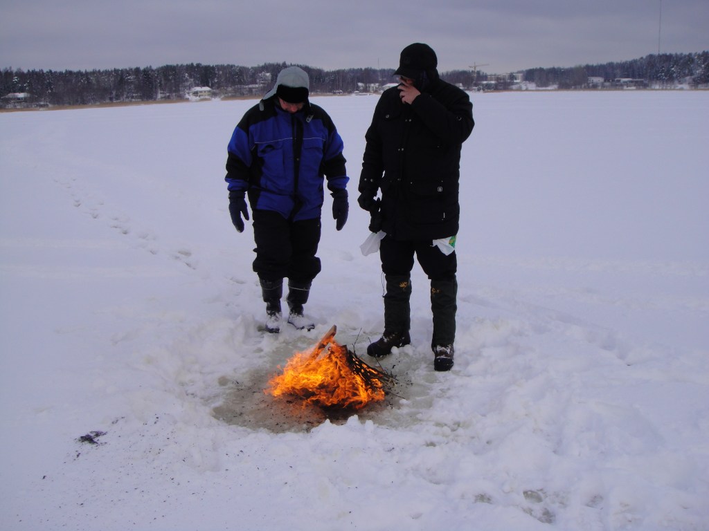 Hauskaa hubaa riitti myös nuotion tekemisessä, kun kaverukset kasasivat notskin jäälle ja Skele kävi repimässä vuorineuvoksen rannasta pajunkepit, joilla slerssit kärvennettiin. Kiitos makkaroista, kuka ne sitten tarjosikin! Karri oli mukavassa sievässä ja piti yhteishenkeä yllä normaaleilla halauksilla ja huudoilla. Meidät ainakin kuultiin….
