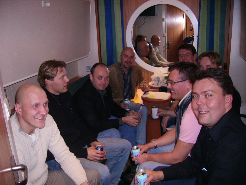Safkan jälkeen pidettiin kokous hytissä, kun kaikki äijät olivat ensin löytäneet sinne. Kokous vietiin poikkeuksellisen ripeästi läpi, reilussa puolessa tunnissa. Päivällä kiekkoa pelaamassa käyneet siat suuntasivat sen jälkeen hyllylle. Muut keskittyivät nestetankkaukseen ja saatiin kai aikaan muutama yhteislaulukin. Baariin asti päästiin taas kerran vasta lähempänä puolta yötä ankaran tissuttelun jälkeen ja totutusti ryhmä oli taas ympäri laivaa tuhannen päissään. Aamulla päälukua laskettaessa todettiin, että kaikki siat ovat tallella, kukaan ei joutunut putkaan tai päässyt maihin asti. Sikäli onnistunut reissu. Tallinnan missaamisen pystyi laittamaan kehnon kelin piikkiin.