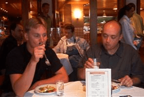 Ekaan baariin ehdittiin suihkun jälkeen jo ennen laivan irtautumista satamasta. Pienet rouheet, bisset ja seuraavaan kuppilaan. Laiva lähti ja välittömästi ulkona alkoi taas valtava sade. Varmaan se sama saatanan pilvivyöhyke, joka oli seurannut Tiksistä lähtien, välillä etäämpänä, välillä päällä. Tshekin rajan harhautusliikkeet toimivat laivalle asti ja sateenpaska missasi meidät muutamalla minuutilla. Raivon salamat olivat todella valtavia, ikkunan kuivalta puolelta katsellen jopa näyttäviä. Tax-free aukesi ja haimme lastin haisevaan hyttiin. Baarissa GT maksoi femman, kaupassa leka 60-volttista Kossuvodkaa 8 euroa. Kumpikohan kannattaa valita. Otettiin hytissä pienet nosteet ja pelättiin naruilla sidottujen pyörien kaatuvan navakassa tuulessa.