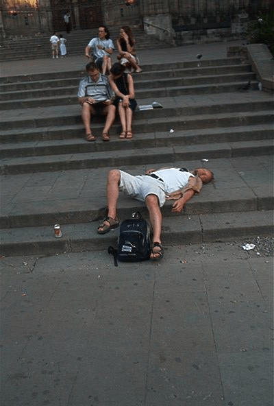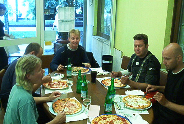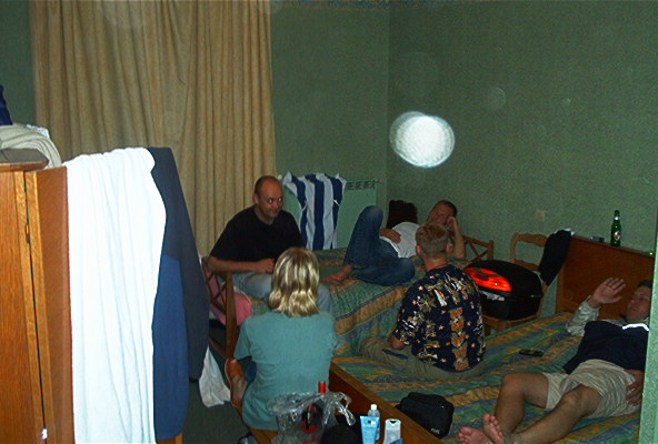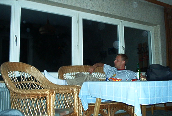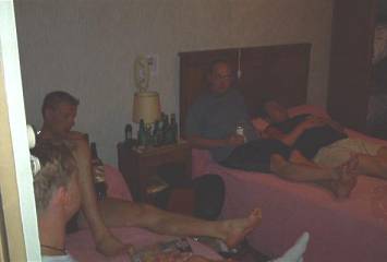 Baarissa tutustuttiin muutamaan amsterdamilaiseen heppuun, joilta saimme vinkkejä Damin leirintäalueista. Sääli, ettei kukaan muistanut tarkkoja koordinaatteja enää aamulla. Hemmot ajelivat Goldwingillä, mutta alentuivat silti jubailemaan meidän kanssa. Baarit menivät kiinni ja jekkukin oli loppu. Mentiin sitten vähitellen venäläisiä täynnä olevaan huoneeseen, jossa lepotuolimestat olivat. Fiksuimmat ottivat makuupussit mukaan, itse nukuin lattialla ilman sellaista ja Keiko kapusi Pekin vastusteluista huolimatta Pekin makuupussiin. Fantastic. Nämä olosuhteet eivät olisi kelvanneet selvinpäin.