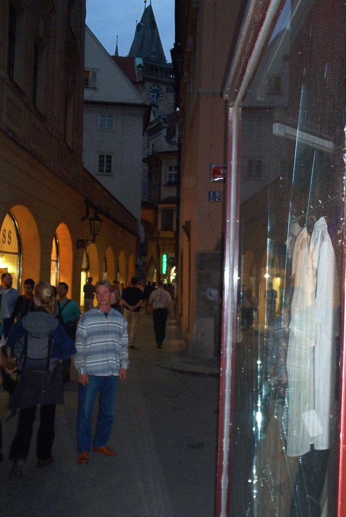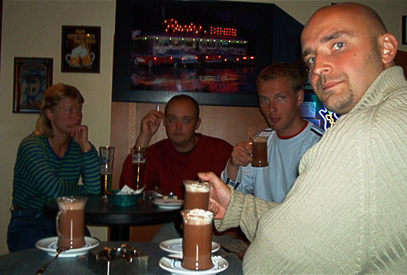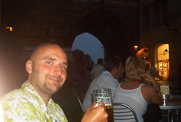 Aterioinnin jälkeen kävelimme Kaarlen sillalle ja suoraan yli vanhaan kaupunkiin. Kierreltiin pubeja ja nautittiin suunnattoman halpaa olutta. Edullisin puolen litran stobe taisi olla 18 ählämiä eli noin 0,6 euroa. Mun kuvassa näkyvä parittajanpaita herätti jokaisen sisäänheittäjän mielenkiinnon ja kaverit yritti vongata jokaiseen mahdolliseen yökerhoon ja strippiluolaan. Karrin teinimäinen look ei vaikuttanut samalla tavalla. Päädyimme kuitenkin viettämään aikaamme pubeissa ja yritimme sivusilmällä seurata yleisurheilun EM-kisoja. Saimme samaan aikaan viestejä, että toinen ryhmä nukkuu Rostockin satamassa, totesimme itsellämme olevan vähän paremminJ