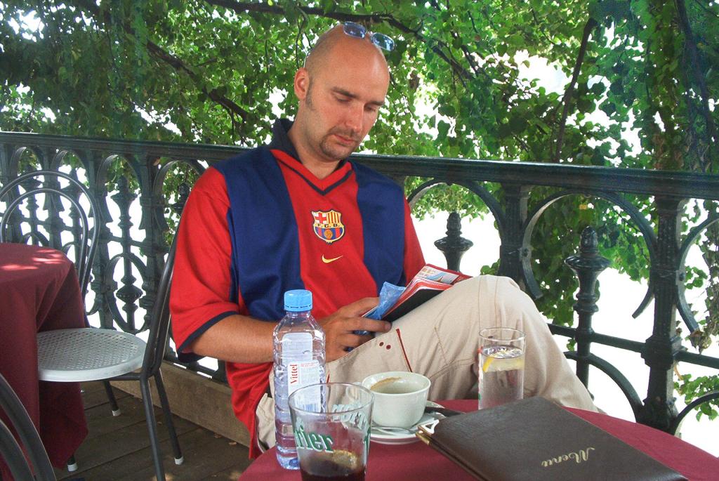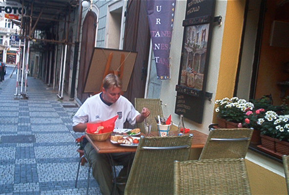 Heräiltiin yhdentoista pintaan oletetun narkkarin kämpiltä. Kurkku oli vähän kipeä, mutta se mennee ohi. Legojen pesu ja sitten lähdettiin kylille. Mentiin spåralla lähelle Moldaun rantaa, haettiin kiskalta tuliaisia ja postikortteja sekä asemalta postimerkkejä. Käveltiin joen rannan kahvilaan aamukaffelle ja kortteja kirjoittamaan. Sää oli upea ja tunnelma taivaissa. Huomioi kuvasta kahvikuppi ja vesipullo, monikertaiset hinnat olueeseen verrattuna, silti terveellinen ratkaisu.