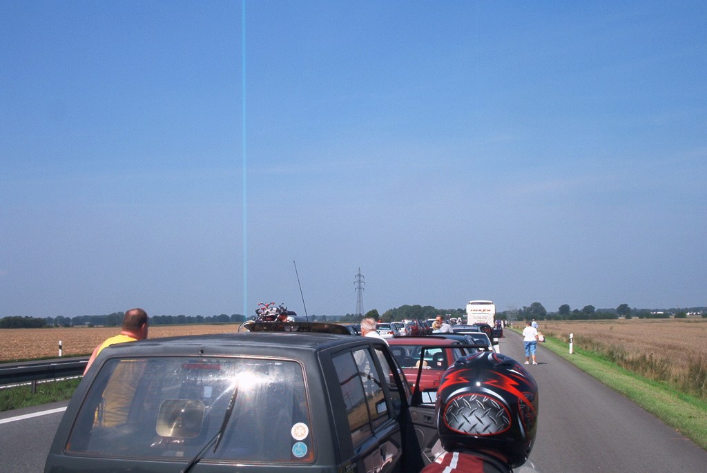 Baanalle lähdettiin lopulta 11.30 hyvin levänneenä. Varsin nopeasti oltiin jo viidenkympin päässä Berliinistä Hampurin ja Rostockin baanalla tankilla. Tankin jälkeen vähän reilu kymppi juuri ennen Rostockin tien erkaantumista liikenne baanalla seisahtui. Ajoimme ujosti piennarta pitkin jonojen ohi useita kilometrejä, kunnes tulimme lähelle suhteellisen tuoretta ketjukolaripaikkaa. Ohi ei ollut menemistä. Neljä-viisi autoa olivat ajaneet nippuun, mutta ilmeisesti isompia vahinkoja ei ollut tapahtunut. Puolen tunnin tien sulkemisen aikana jonoa kertyi varmaan Berliiniin asti.