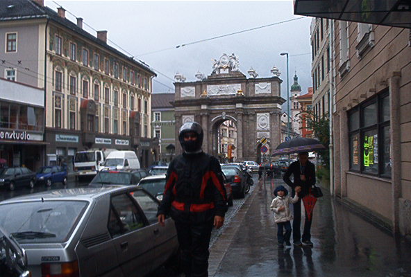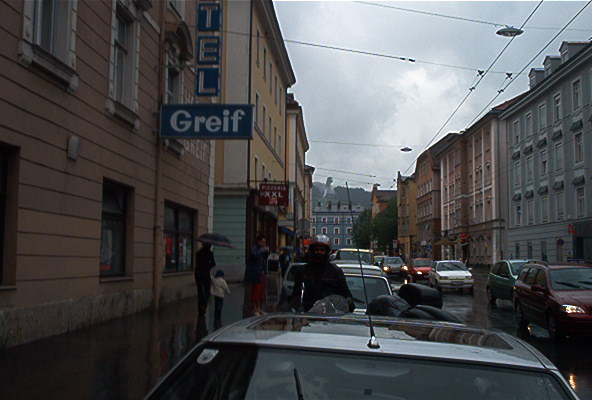 Motareille löytyy kyllä opasteet, mutta päätäpä kokeilla jotain vaihtoehtoreittiä… Pyörimme kaupungilla hetken aikaa ja huomasimme, kuinka kahdestaan kulkeminen on huomattavan paljon helpompaa – etenkin paskalla kelillä ja vilkkaassa liikenteessä. Muutamissa risteyksissä kaupungilla oli todella liukasta veden taas lainehtiessa tiellä. Salzburgin tie löytyi ja ajoimme maantietä joen varrella tuhansien kylien läpi. Vajaa tunti Innsbruckin jälkeen sade taukosi ja päästelimme kunnolla menemään. Matka eteni pitkästä aikaa kunnolla. Pysähdyimme ennen St. Johann im Tirolia tankille ja tankkauksen aikana taivas taas aukesi. Pidettiin katoksella hetki sadetta ja nautittiin kokikset.