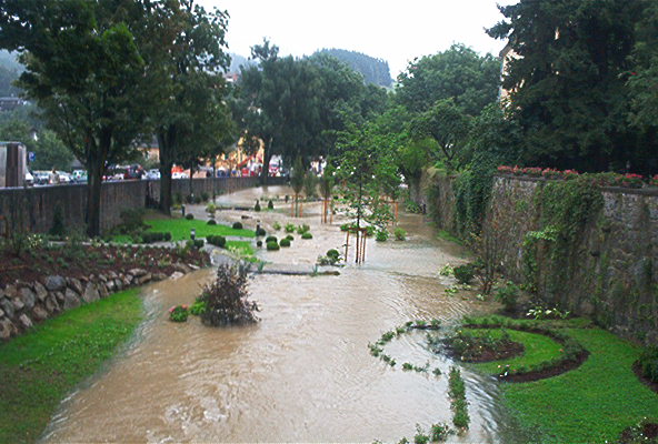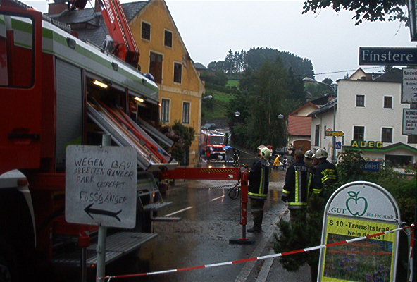 Linzin jälkeen oli vielä muutama kymmenen kilometriä Freistadtiin, joka oli päivän tavoitekohteemme. Freistadtista olisi Tshekkiin enää toistakymmentä kilometriä ja Prahaan noin kaksisataa. Viimeinen taival oli erityisen ikävää ajaa, vaikka sade alkoi jo hieman hellittää. Mutkaisella tiellä oli kerros vettä uudehkon asfaltin päällä ja mun takarengas alkoi olemaan aika sileässä kunnossa. Pitoa ei siis juurikaan löytynyt ja ajo meni välillä aikamoiseksi mateluksi. Saavuimme Freistadtiin seitsemän jälkeen ja kaupunki oli pienehkössä kaaoksessa. Tulva oli sekoittanut kivan pikku cityn, kun läpi virtaava pieni puropahanen tulvi yli äyräidensä. Puro on yksi Vltava-jokeen johtavista pikku-uomista, jotka aiheuttivat lopulta pahimmat tulvat Euroopassa 500 vuoteen. Nice! Freistadt vilisi brankkareita ja poliiseja, ja juuri ennen kaupunkia yksi pieni lampi oli levinnyt jo päätien yli viereiselle pellolle.