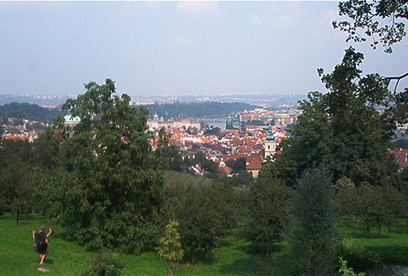 Prahan länsireunalla on rinteellä upea puisto, josta on mahtavat näkymät kaupungille. Puistosta löytyi myös viehättävä terassi, josta olisi saanut todennäköisesti varsin hyvää ruokaa. Me tyydyimme janon sammuttamiseen rankan kiipeilyn jälkeen. Huomoitavaa oli myös ravintolan äärettömän kaunis tarjoilija, josta valitettavasti emme saaneet kuvaa.
