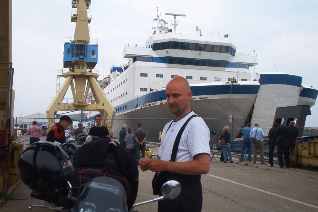 Laiva tuli Rostockiin viideltä täydellisesti aikataulussa. Laivasta päästiin näppärästi ulos ja suoraan baanalle ilman minkäänlaisia muodollisuuksia satamassa. Rostockissa harhailimme hieman, kun etsimme pienempää tietä Lübeckiin ja tankille. Selityskin harhailuun löytyi kartalle päästyämme. Laiva tuli eri paikkaan, kun aluksi kuvittelimme ja olimme siis ikään kuin väärällä tiellä, vaikka kuitenkin aivan oikealla!? Ajoimme sitten autobaanaa pitkin Wismariin ja hetkittäin pelkäsimme gason loppuvan. Moottoritie oli täysin uutta, eikä alkumatkalla ollut yhtään huoltoasemaa. Kylttejä löytyi, mutta paikat olivat vasta rakenteilla. Kaikesta huomasi, että olimme entisen Itä-Saksan puolella ja infrastruktuuria vasta rakennetaan läntisen Saksan tasolle. Mulla oli edellisestä tankista lähemmäs 300 km takana, mutta varatankki ei kuitenkaan kolkutellut. Wismarista saimme gasoa ja jatkoimme todella makeaa pienempää baanaa kohti Lübeckia. Meri vilahteli välillä oikealla puolella, metsäkauriita näkyi tien varrella ja aivan upeita puita roikkui tien yllä. Fiilis oli vahvassa nousussa.