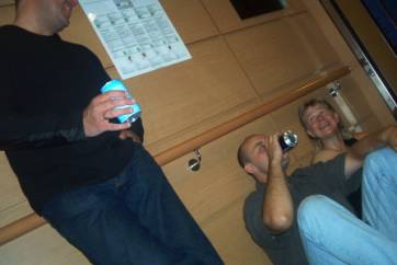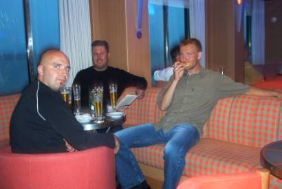 Pojat tulivat saunasta juotuaan sixpäkit mieheen, olivat aika väsyneessä kunnossa. Pekin kanssa saatiin jopa kunnon yhteislaulut aikaan… kusella käydessä. Kuulosti ilmeisesti todella hyvältä, kun muutama rekkakuskikin yhtyi ’Lauantai-illan’ ulvontaan. Muuten laivan meininki oli aivan onnetonta, joten oli keskityttävä pelkästään juomiseen.