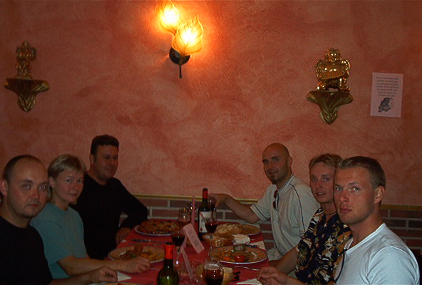 Varttia vaille seitsemän illalla lähdettiin spåralla vanhaan kaupunkiin ruokapaikkaa etsimään. Pienen kiertelyn jälkeen päädyimme lopulta jenkkien suurlähetystön vieressä sijainneeseen välimerelliseen ravintolaan. Safkat olivat varsin mainiot. Etenkin Karri söi itsensä turvoksiin, lähinnä valtavan alkusalaatin takia.