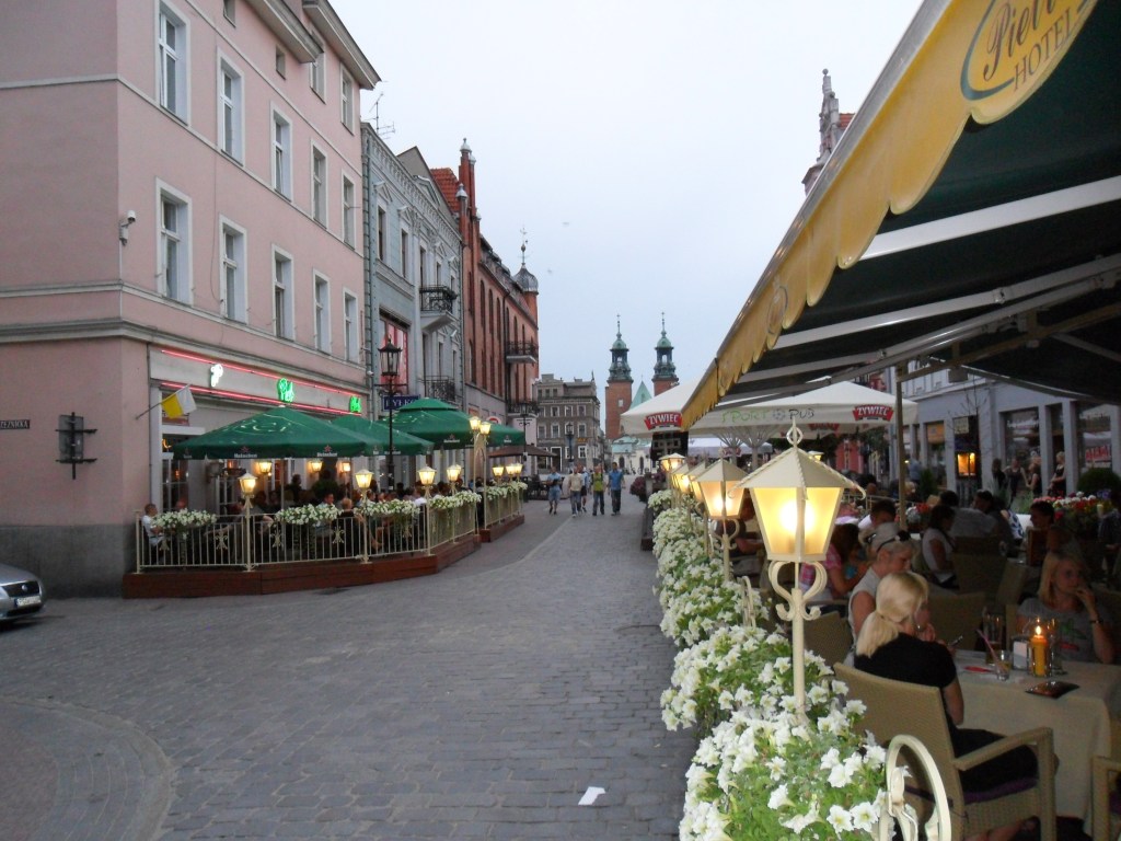 Seuraavalla taipaleella tuli vähän kiertoajelua, kun ajeltiin kohti Bydgogtzia. Pieni jaloittelutauko matkan varren cityssa ja saman tien kivaa ja hyväkuntoista tietä Gnieznoon. Olimme buukanneet sieltä lähtöpäivänä hotelli Pietrakin, neljän tähden hotellin aivan keskustasta – hinta 52 €/huone aamupalalla. Ei paha. Matka oli juuri sopiva laivan tuloaikataululle, sillä sisäänkirjautumisen ja suihkun jälkeen olimme puoli yhdeksän maissa raikkaina hotellin kävelykadun terassilla. Siinä söimmekin aivan upeat ateriat hyvän viinin kera. Safkan aikana alkoi ukkostaa ja jälkkärit jouduimme nauttimaan sisällä. Safkan jälkeen vielä piipahdus toiseen baariin ja puolilta öin nukkumaan ensimmäisenä varsinaisena reissupäivänä.