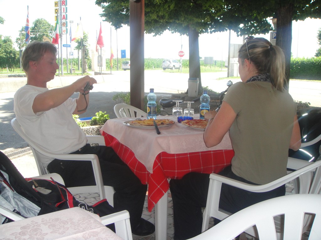 Keli kirkastui, kun ajeltiin huikeita väyliä kohti Lienziä. Vastaan tuli valehtelemattomasti satoja moottoripyöriä. Ennen Lienzia otettiin suunta kohti Spittalia ja Oberdrauburgista etelään Plöcken Passille. Siitä alkoi aivan upea vuorten ylitys Italian rajalle, vaikka tie olikin paikoitellen aika kepulia. Italian puolella ajeltiin sitten kohti Udinea, kunnes tuli taas peri-iltalialaista tankkiongelmaa huoltsikoiden ollessa sunnuntaisin kiinni. Automaateissa tuntui käyvän vain paikalliset kortit. Usean yrityksen jälkeen lopulta Dignanon paikkeilla saatiin automaatilta käteisellä gasoa. Samaan stoppiin onnistuttiin myös ostamaan bisseä ja viiniä mukaan hotellille ja haukattiin pizzat evääksi. Erityismaininnan ansaitsee Karrin pizza makkaraperunatäytteellä.