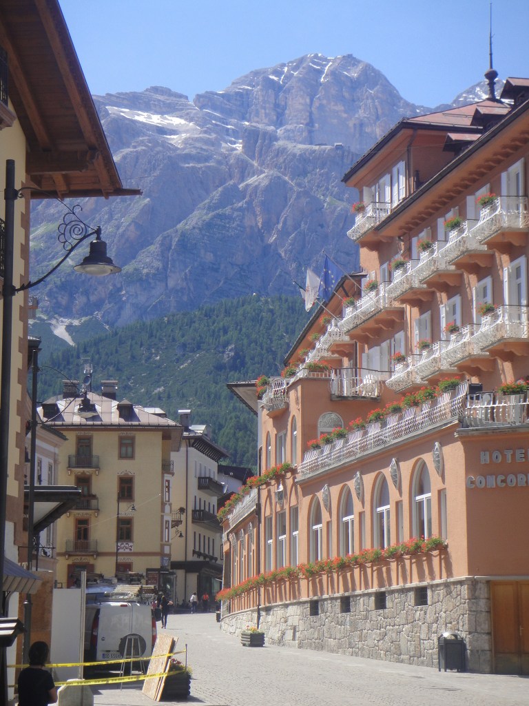 Ajettiin ensin kohti Trevisoa ja tultiinkin tosi sujuvasti vähän kypsän oloisia teitä. Trevisossa oli vähän huono opastus ja ajettiin sen jälkeen vähän kiertoteitä ja odotettua hitaammin Feltren kautta Bellunoon. Sieltä päästiin taas pääväylälle kohti Cortinaa. Maisemat alkoivat muuttua hetki hetkeltä upeammiksi. Liikennekin lisääntyi ja nautimme maisemista enimmäkseen jonoissa ajellen. Tultiin Cortinaan lounaspizzalle kolmen maissa. Hieno kaupunki, johon olisi hyvin voinut jäädä pidemmäksikin aikaa, mutta nyt matkan oli kuitenkin jatkuttava.