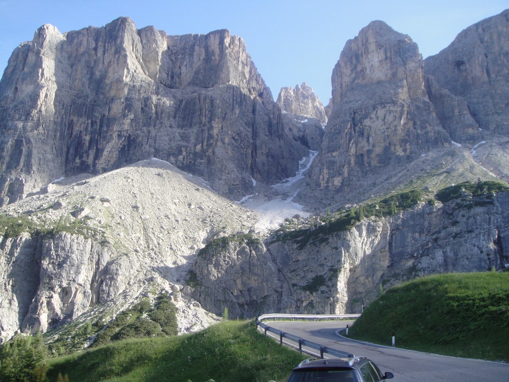 Hyvien pizzojen jälkeen ennen neljää päästiin taas liikkeelle. Missattiin ekan suunnitellun vuoriylityksen risteys ja ajettiin pohjoisesta Toblachin kautta Bruneckiin ja sieltä polttavassa kuumuudessa kohti Passo Gardenaa. Eli vahingossa päädyttiin todennäköisesti paljon upeammalle reitille, sillä Gardenan jälkeen tuli putkeen kolme muutakin upeaa ylitystä ja lukemattomia laskettelukeskuksia; Alta Badia ja Val Gardena tunnetuimpina. Lopulta ajettiin kohti Val di Fiemmeä.
