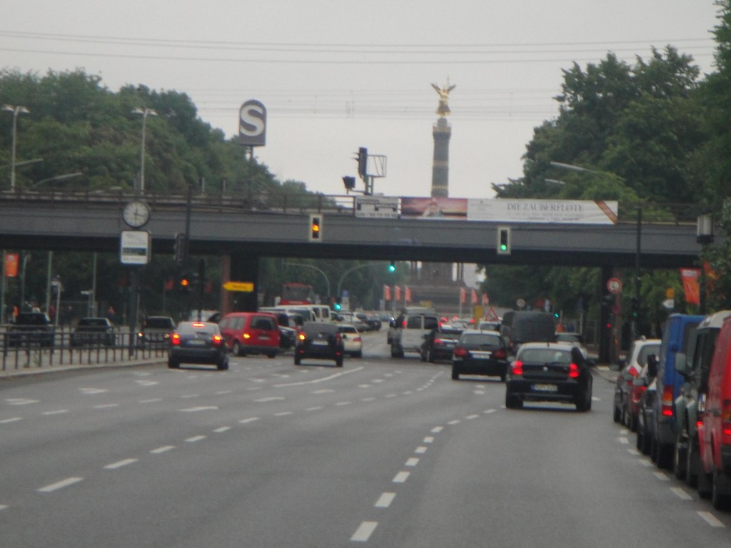 Ennen Potsdamia pidettiin ketjujen rasvausstoppi, sitten jatkettiin kohti Potsdamia edelleen hiljaisessa liikenteessä. Potsdaminkin läpi pääsimme sujuvasti ja sitten jouduimme motarille kohti Berlin Zentrumia. Vähän hirvitti jättiläiskaupungin liikenne, mutta toisaalta heinäkuinen sunnuntai on paras päivä ajaa sen ytimeen. Lopulta pahimmat ruuhkat tulivat juuri ennen Berliiniä messualueen liittymissä, mutta siitä selvittyämme ajelimme juhlavasti läpi Tiergartenin Brandenburgen Torille. Siitä edelleen kohti Alexanderplatzia.