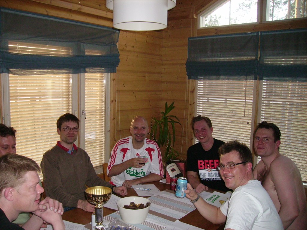 Lauantaina porukka pieneni vielä puoleen. Pieni, mutta sitäkin laadukkaampi – vain neljä nasua – ryhmä vietti upean kevätpäivän Vesijärven terassilla Lahdessa. Jännä kontrasti, kun aurinko porottaa kesäisesti ja järvi vieressä oli umpijäässä. Ilta meni sitten vähän rauhallisemmin kiekkoa katsoessa. Suomen ja Norjan MM-kiekkoavaus oli melko unettava useimmille meistä. Kiitokset taas kerran osallistuneille sioille. Tämänlaisella osallistumisella vaan joudumme kehittämään vähän toisenlaista touhua kevätkokouksiin. Kymmenen hengen mökki on vähän turhan iso neljälle ukolle. Mutta ihan nastaa oli ja taas kerran kelitkin suosivat meitä Vierumäellä.