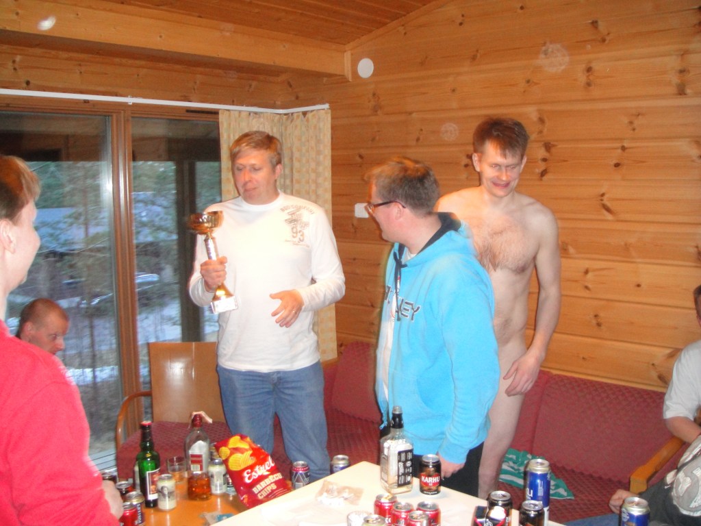 Muut vesselit jolkottelivat apostolin kyydillä kohti oudolla sijainnilla ollutta kämppää. Poikkeuksen teki ansaitusti vuoden sikatittelin voittanut Lare, joka huumassaan päätti tilata cäbin paikalle. Sen verran siinä pirssin tulemisessa kesti (Lahdesta tai Heinolasta tullessaan), että Lare kuitenkin vaihtoi suunnitelman A:n B:ksi, ja lähti samoilemaan kohti mökkiä. Cabin saapuessa paikalle ja huudellessaan tilaajaa Veikko ilmoitti kuskille, että kyllä se meidän porukkaan kuuluu. No, ei kun Veikkoa toppuuttelemaan ja Laren perään kohti kämppää. Kämpillä vielä parannettiin maailmaa jokunen tunti ennen kuin väsy tuli puseroon jokaiselle yksi toisensa jälkeen.